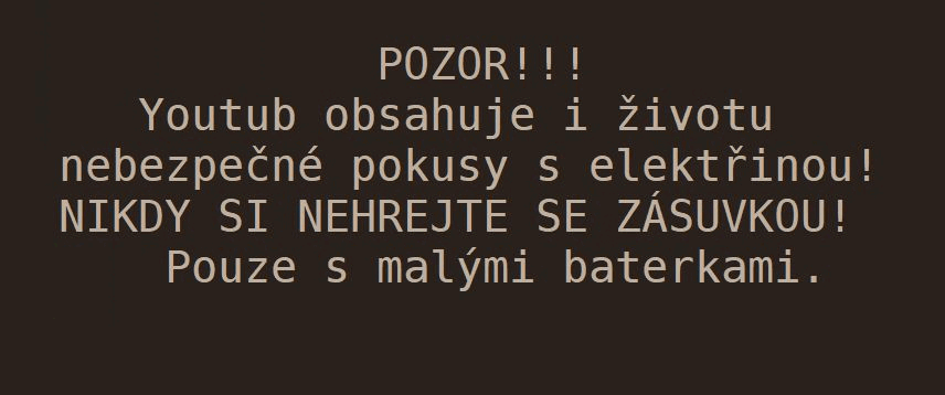POZOR! YOUTUB OBSAHUJE I ŽIVOTU NEBEZPEČNÉ POKUSY S ELEKTŘINOU!!! JSOU TO TY KDE SI HRAJÍ S VIDLICEMI, TAK NEBLBNĚTE!